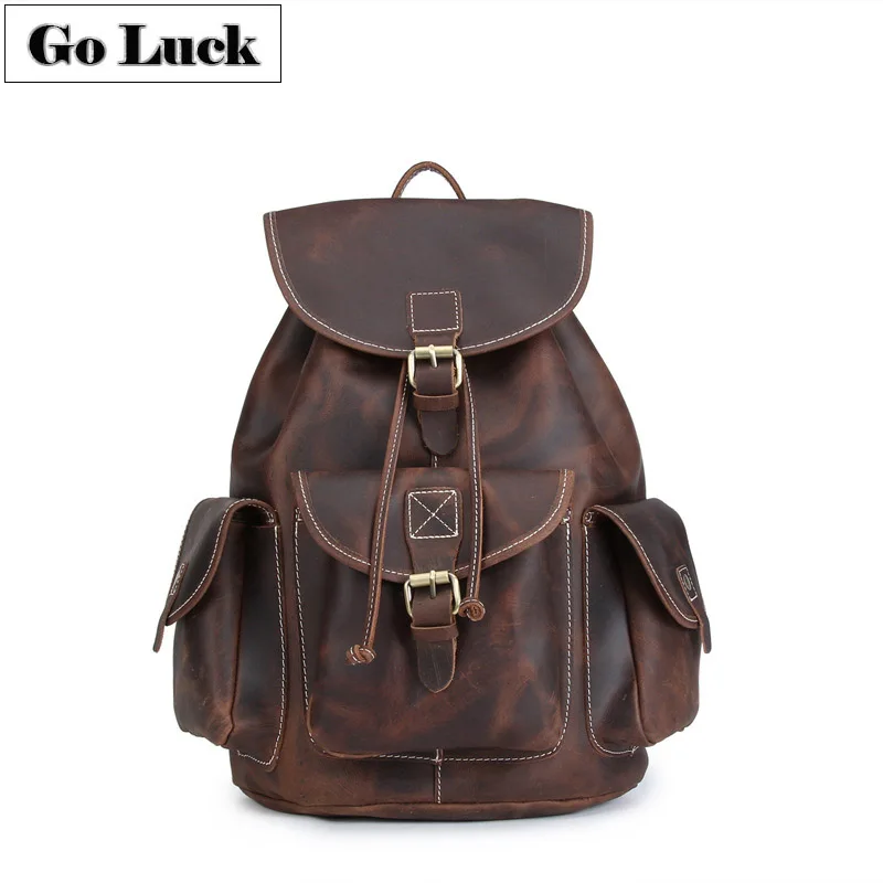 Best GO-LUCK Brand Hand-made Crazy Horse Genuine Leather Casual Travel Backpack Men Cowhide Backpacks Me