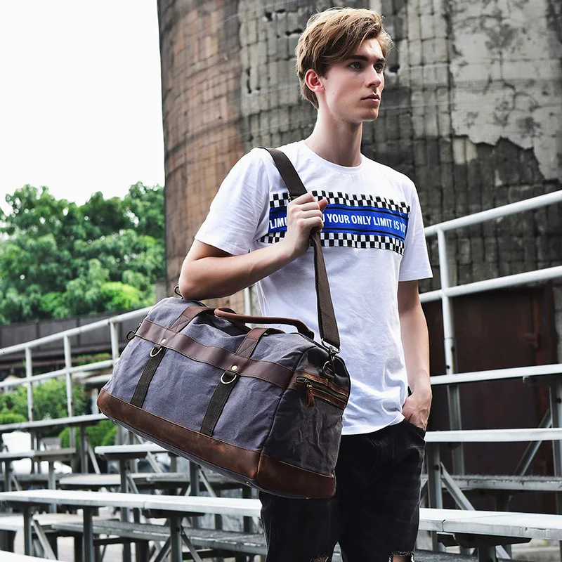 New Crazy Horse Leather Canvas Travel Bag Large Capacity Luggage Bag Men Shoulder Travel Duffel Bags Wo