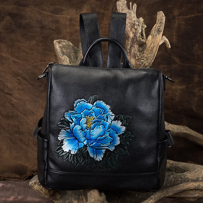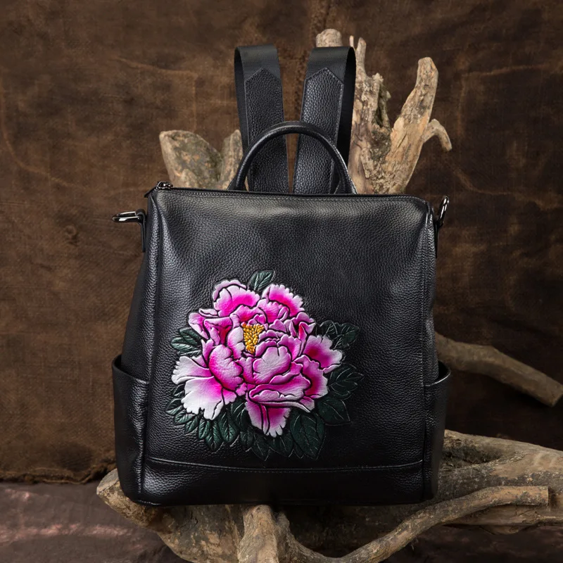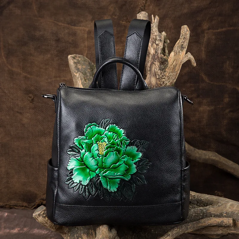 Best Genuine Leather Women Backpack Rucksack Peony Pattern Travel Bag Single Shoulder Bags Embossed Cowh