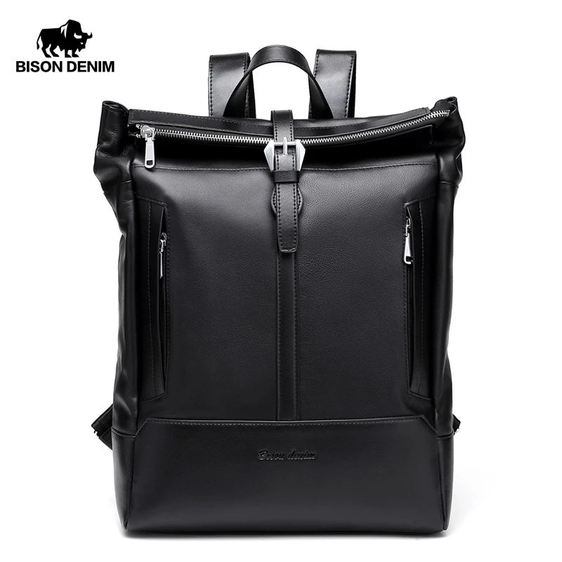 Get BISON DENIM Genuine Leather Backpack Male 15 inches Laptop Bag Travel Men Backpack Lock Schoolbag F