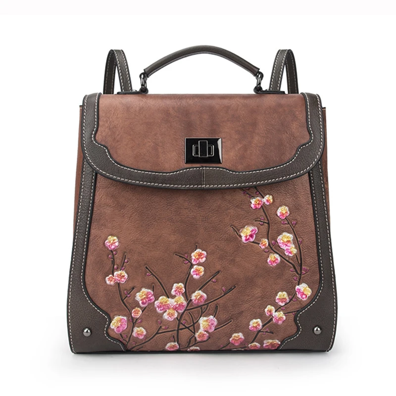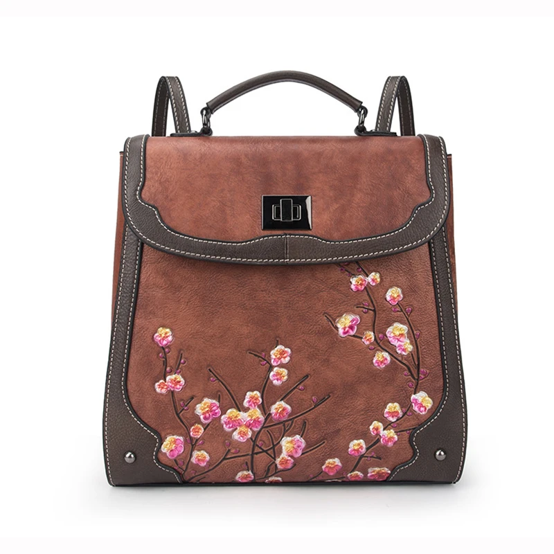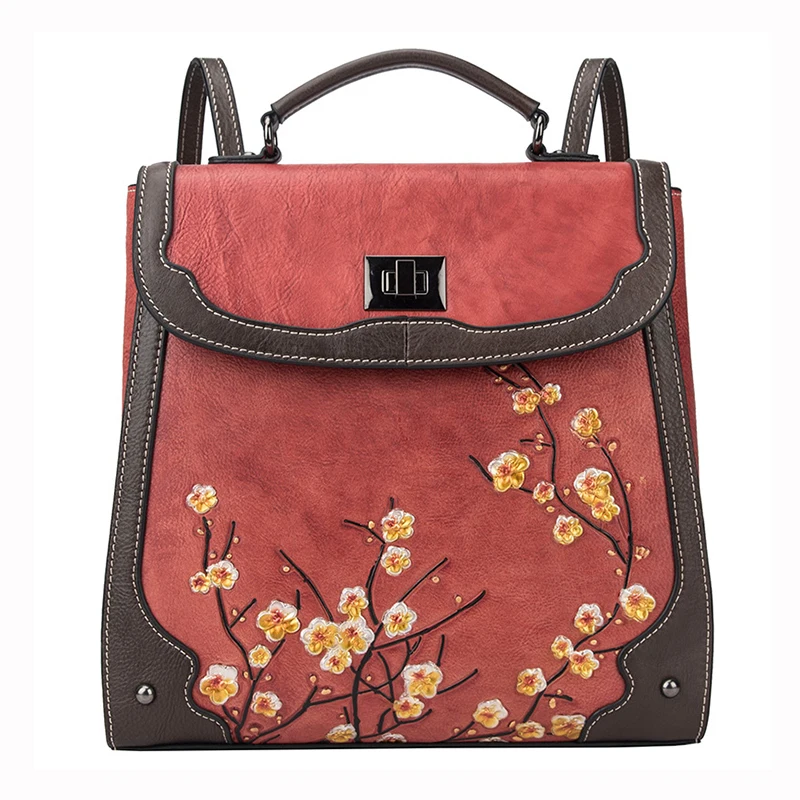 Special Product Genuine Leather Women Rucksack Backpack Brush Color Bag School Book Travel Plum flower Lady Retro K