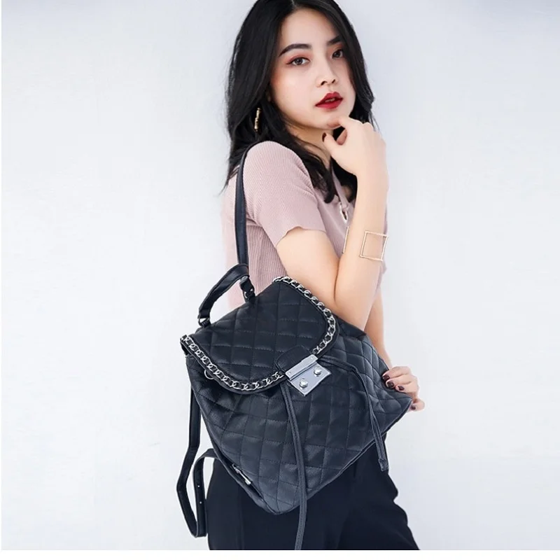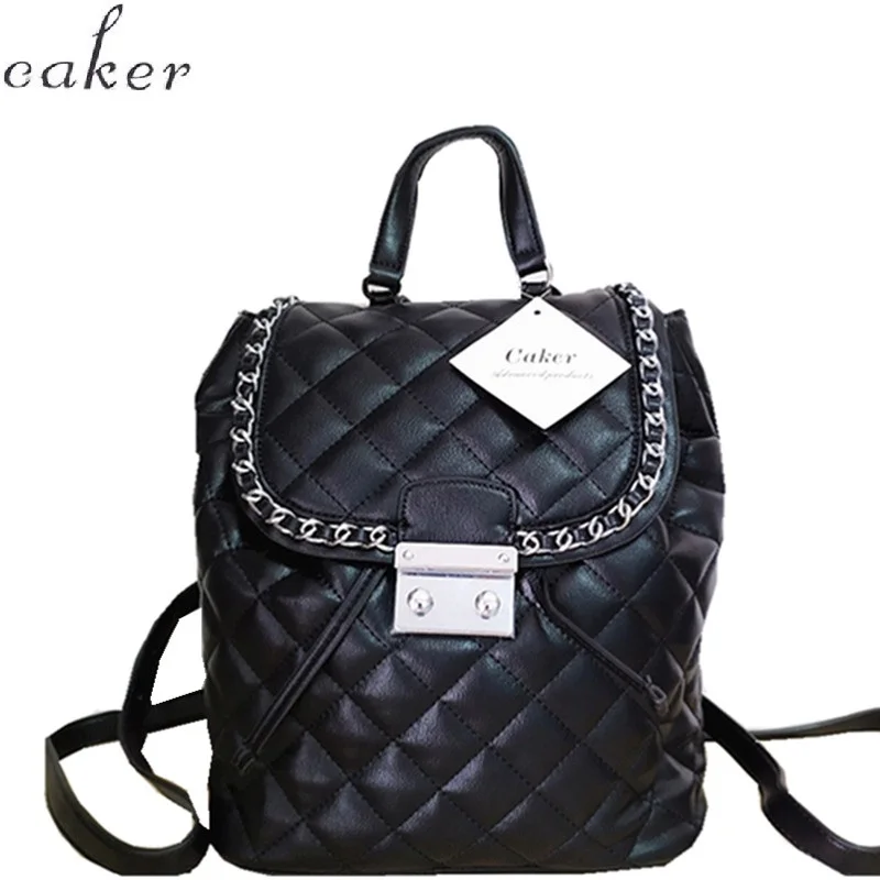 Home » backpack , hot product , travel » Discount Caker Women Drawstring Backpack Diamond Lattice Plaid PU Leather Black Large Chain School Bags For